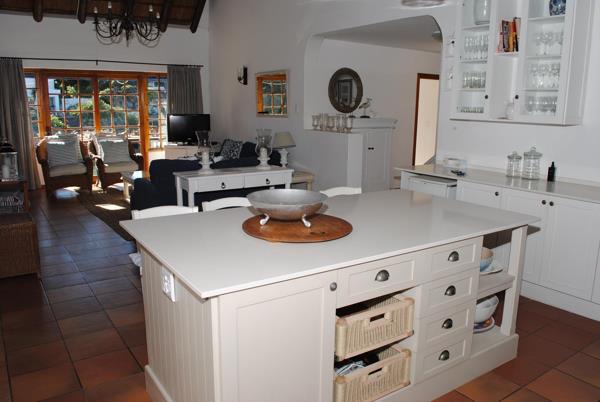 The kitchen and open plan living areas with sliding doors open onto the entertainment area with a build in braai, leading to the Canal frontage with jetty and a little beach.