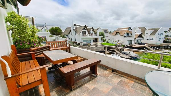 The mid-level offers the main kitchen, lounge with DSTV and a dinning area that leads out onto a patio with a built in braai overlooking the Canals. The kitchen is equipped with an electric hob, eye level oven, fridge, dishwasher, washing machine and dryer. The main bedroom is also on this level, with views over the Canal and an en-suite bathroom. There is another bedroom with a corner balcony with Canal views, it is served by a bathroom just next to it.