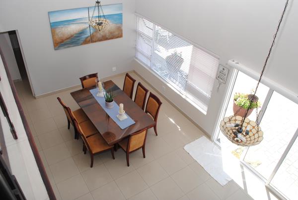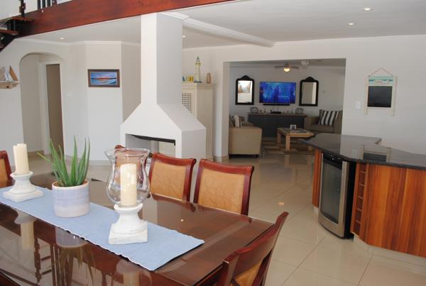 This house also has a braai room with a built in braai and stack doors that open into the garden with stairs leading down to a jetty.