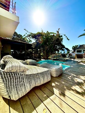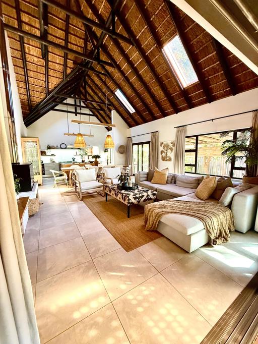 This holiday home displays amazing views of the canal and guests have access to a private jetty & beach. The living, dining and kitchen areas are open planned and spacious, with high thatched ceilings. The bottom floor is wheel chair friendly with no steps and access to two bedrooms and all the living areas. Additionally guests will be able to appreciate Wi-Fi and DStv connection, indoor fireplace and 2 x large outdoor decks and outside lounge area looking over the private swimming pool and canals.
