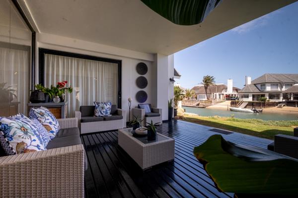 The undercover outdoor area on the canal side boasts breathtaking views of the water, making it the perfect spot to relax and unwind. For added entertainment, the private courtyard features a built-in gas braai for convenience and a Jacuzzi, ensuring hours of fun and relaxation.