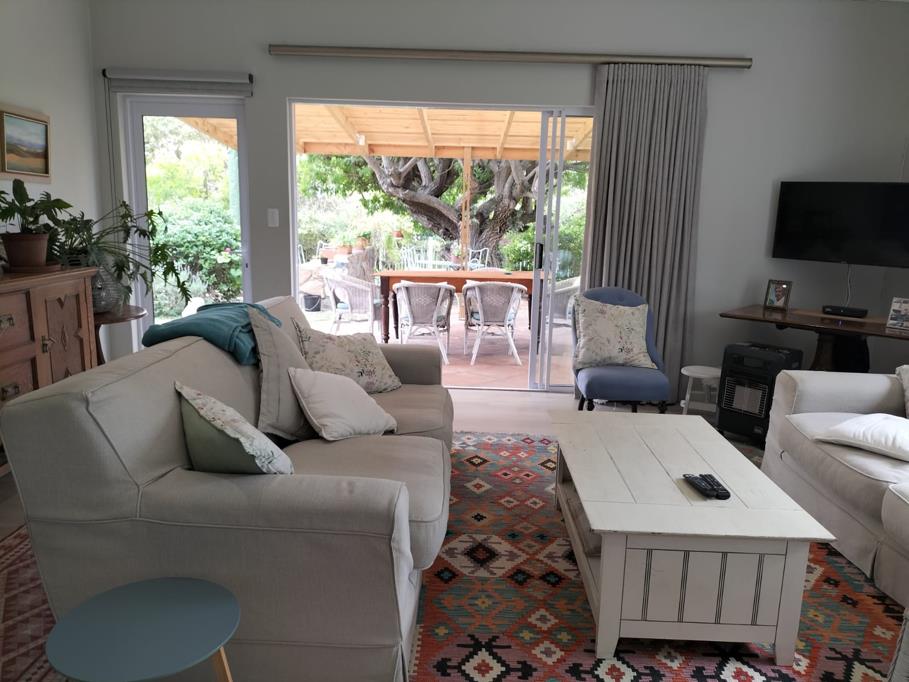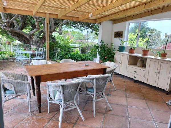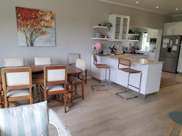 The spacious open-plan layout features a well-equipped kitchen with a separate scullery, flowing seamlessly into the dining area and lounge. The living space opens to a sheltered entertainment area with comfortable outdoor seating and braai facilities, overlooking a beautiful enclosed garden.