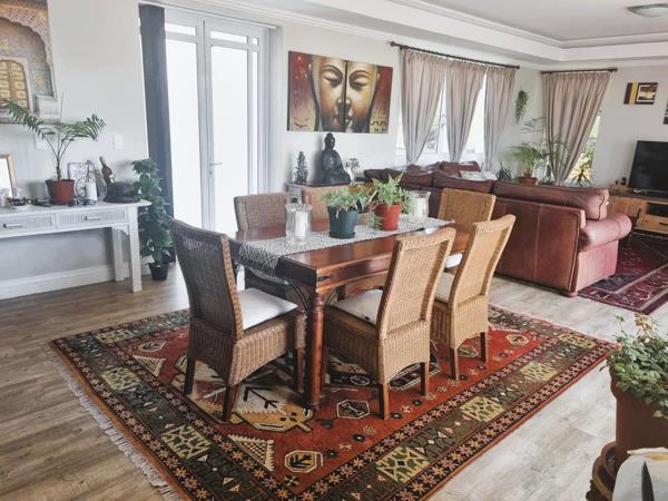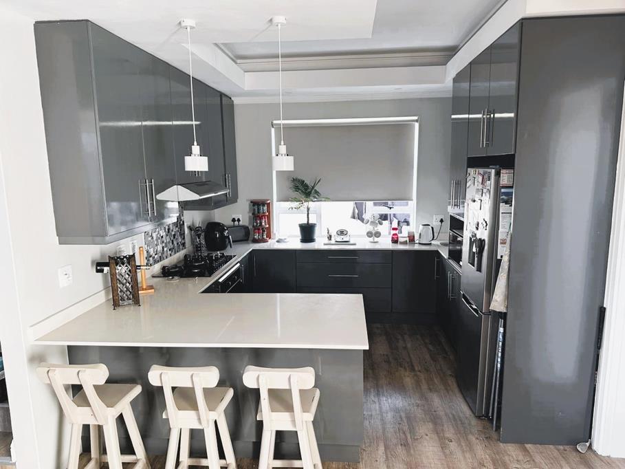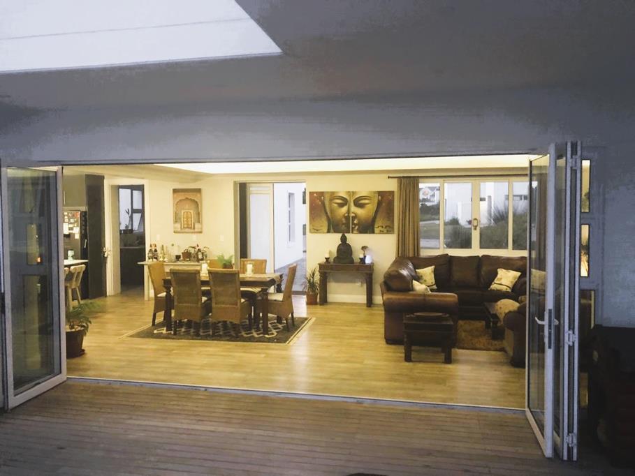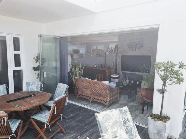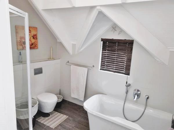 Upon entry you are welcomed into the living area, with the modern kitchen to your right, fully equipped with a gas stove and under counter oven, a separate scullery with washing machine and dryer and Caesarstone counter tops to finish. The dining table looks out over the swimming pool and seats six, while the lounge with DSTV also seats six and has access to the pool and patio via stack doors. Moving through the lounge you will find yourself in the braai room, complete with a built in braai and a bar counter with fridge, there is ample seating for the family, there is even an additional semi-enclosed corner patio and the whole room can be opened up to the pool via the stack doors. There is a guest loo with toilet and basin downstairs.