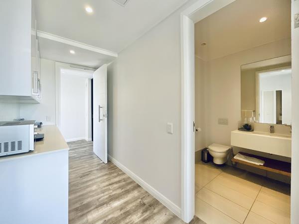 The stylish kitchenette includes kettle, microwave, toaster, and bar fridge.