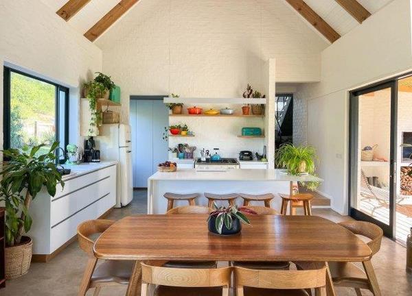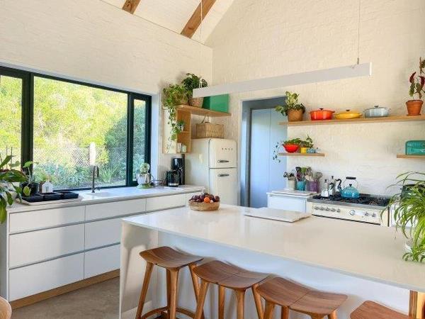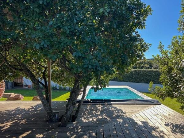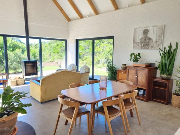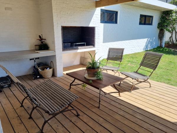 The spacious open-plan kitchen, lounge, and dining area with cosy fireplace flow out to a covered entertainment deck with built-in braai, outdoor seating, and a large enclosed garden with swimming pool perfect for lazy holiday afternoons.