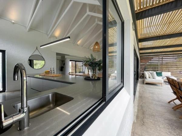 Stacking doors open onto a covered, protected entertainment patio, complete with braai and outdoor furniture - perfect for long lunches, easy evenings, and poolside relaxing.