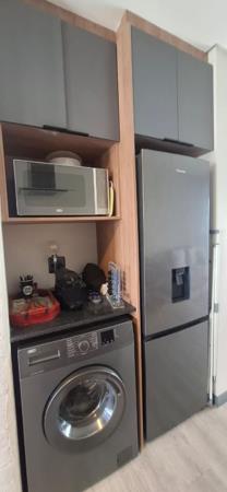 Discover modern living in this inviting 2-bedroom, 1-bathroom apartment located in Pinelands, Port Elizabeth. This contemporary residence features an open-plan design, seamlessly integrating the living area with a stylish kitchen. The kitchen is equipped with sleek black countertops, contrasting grey and white cabinetry, and integrated appliances, including a washing machine, ensuring both functionality and aesthetic appeal. Enjoy abundant natural light and direct access to a private balcony, complete with a built-in braai, offering scenic views and an ideal space for relaxation or entertaining. Both bedrooms are designed with comfort in mind, featuring modern finishes and ample storage, including built-in wardrobes. The main bedroom boasts a large window providing expansive green views. The modern bathroom includes a floating vanity and vessel sink. Situated within a security complex with an access gate and electric fencing, this property offers two dedicated parking bays, providing a convenient and secure lifestyle perfect for professionals or small families seeking a lock-up-and-go home.