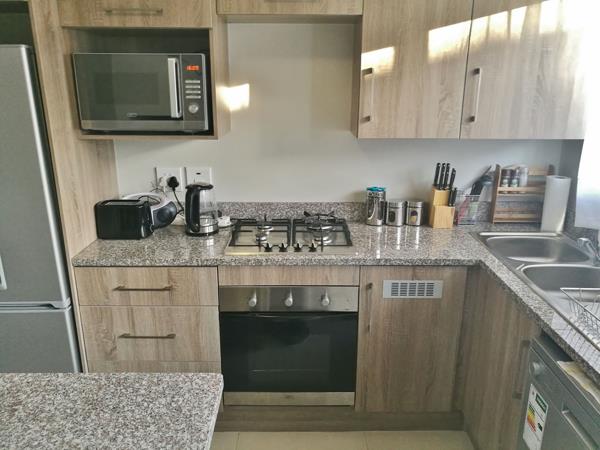 The kitchen is well equipped with ample cupboard space, a gas hob, and an under-counter electric oven, making everyday cooking and cleaning both easy and efficient.
