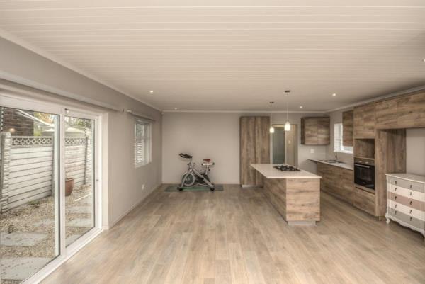 The living area, kitchen and bedroom have gorgeous engineered wooden floors which create a cosy, warm atmosphere. The kitchen is fitted with a gas stove top and an electric oven, a washing machine and a fridge. The flatlet uses solar during load shedding so NO LOADSHEDDING!!!