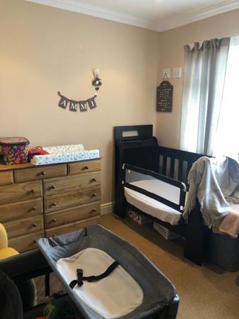 This inviting 3-bedroom, 2-bathroom residence in Mount Pleasant, Port Elizabeth, offers comfortable living with modern finishes. The interior boasts an open-plan living space. Recessed lighting enhances the bright atmosphere, complemented by natural light from large windows. The functional kitchen is equipped with extensive dark wood cabinetry, generous light countertops, a tiled backsplash, and a convenient island/peninsula, providing ample storage and preparation space. An air conditioning unit ensures climate control for year-round comfort.