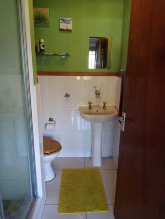 The bathroom is downstairs with a shower, toilet and basin.