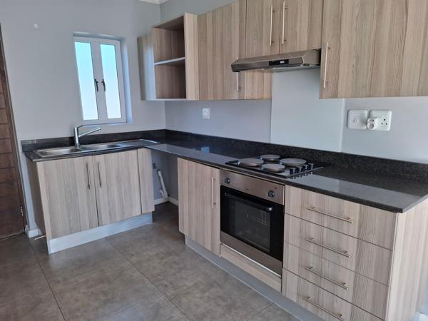 This unit offers two bedrooms with built-in cupboards, a bathroom with a shower, a kitchen with granite countertops, ample cupboard space, an oven, and a hob. The bright living room opens through sliding doors onto a private patio with a built-in braai.