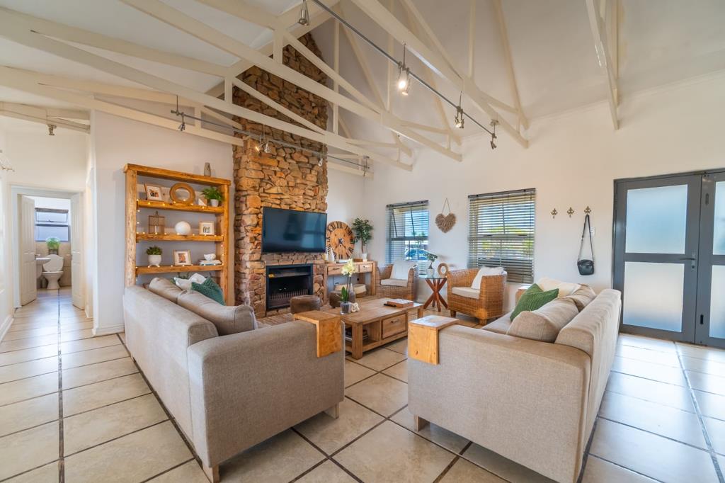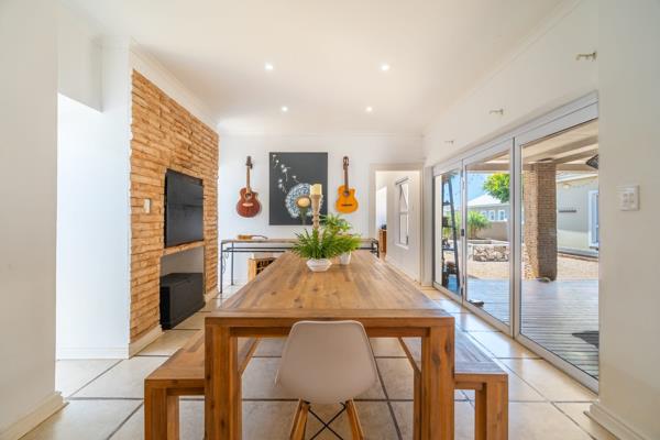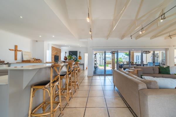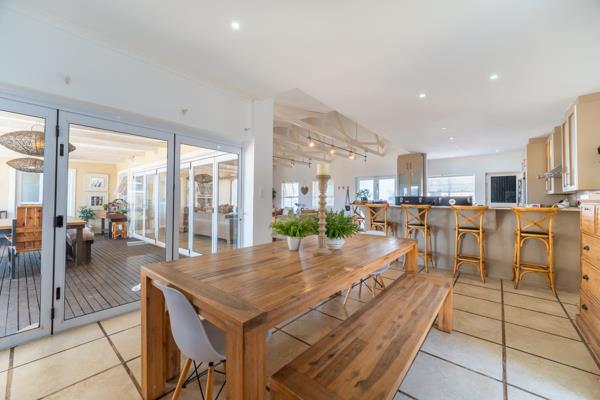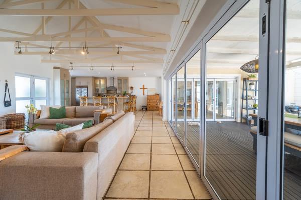 Spacious open-plan living and dining area with stack doors all around opening up onto the outside patio and entertainment area