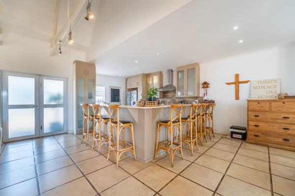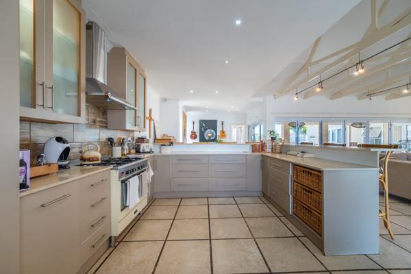 Contemporary kitchen with a gas stove, ample cupboard space and generous work- and seating space.