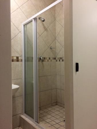 The bathroom has a toilet, basin, and shower.
