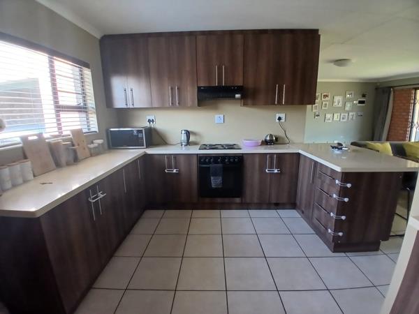 The modern kitchen is well designed with built-in cupboards and a stove with hob, flowing seamlessly into the open-plan living area. The living room opens via a sliding door onto a covered patio with a built-in braai, ideal for entertaining.