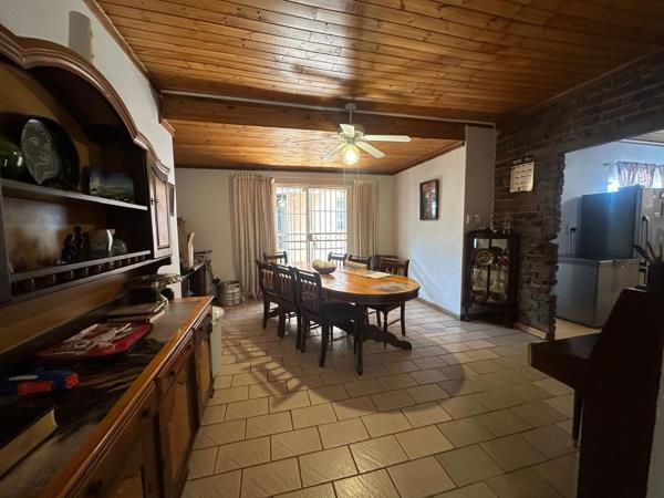 The farm-style kitchen is spacious and highly functional, offering ample solid wood cabinetry, generous counter space, built-in oven and hob, and room for modern upgrades while retaining its character. Adjacent dining areas flow effortlessly, creating a central hub for family gatherings.