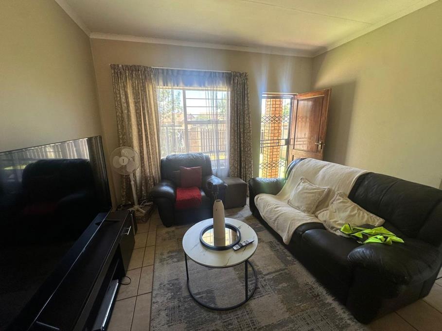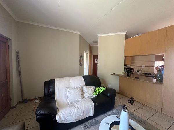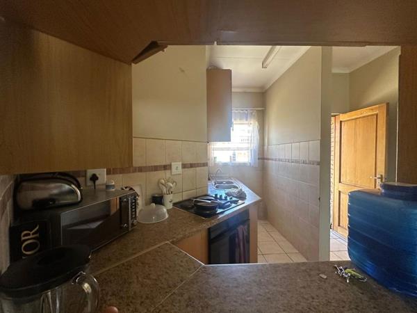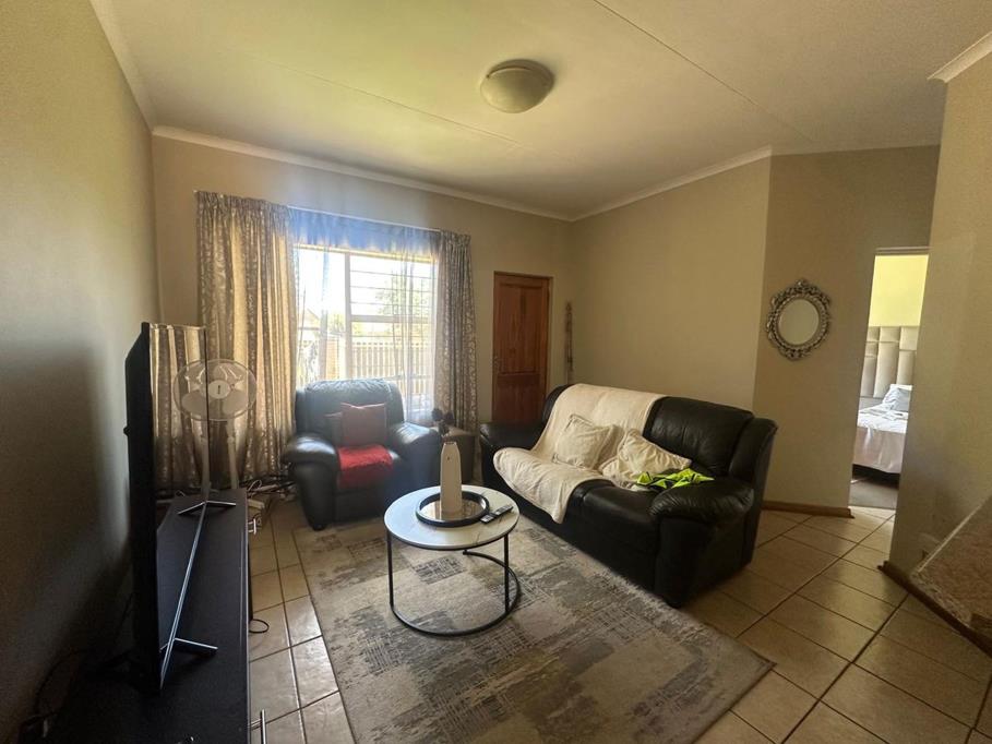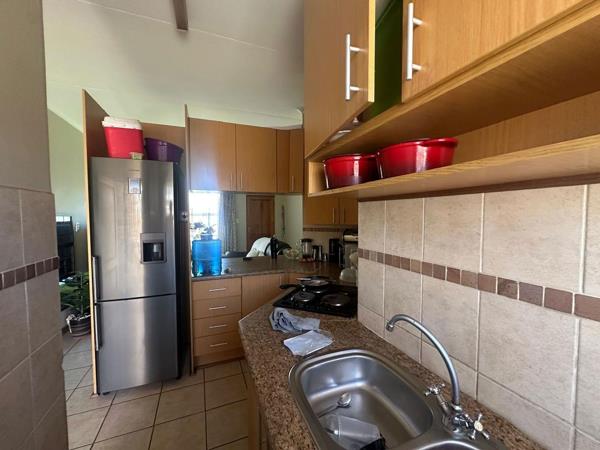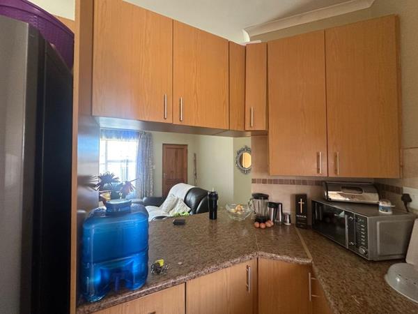 The home features a bright and inviting living area with large windows that draw in natural light and create a sense of openness. The lounge flows easily into a neatly designed kitchen fitted with ample cupboard space, long countertops, a built-in oven and stove, and a double sink. The layout is both functional and efficient, making daily living effortless.