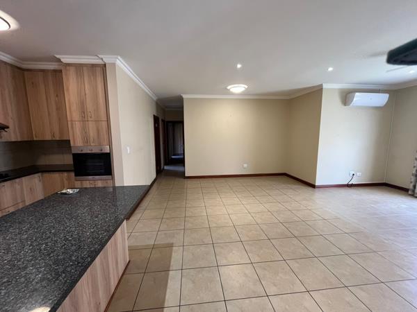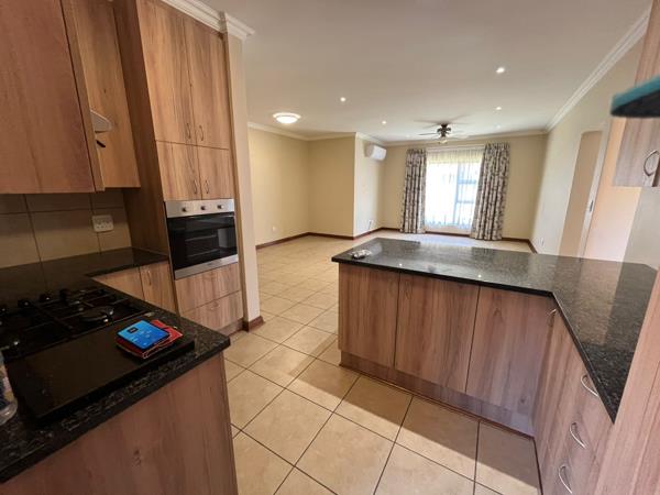 The unit offers three carpeted bedrooms and two bathrooms, one of which is en-suite. The open-plan kitchen is fitted with a gas stove and separate scullery, flowing seamlessly into a spacious, tiled open-plan lounge and dining area. A second lounge leads out to a covered stoep, ideal for relaxed living.