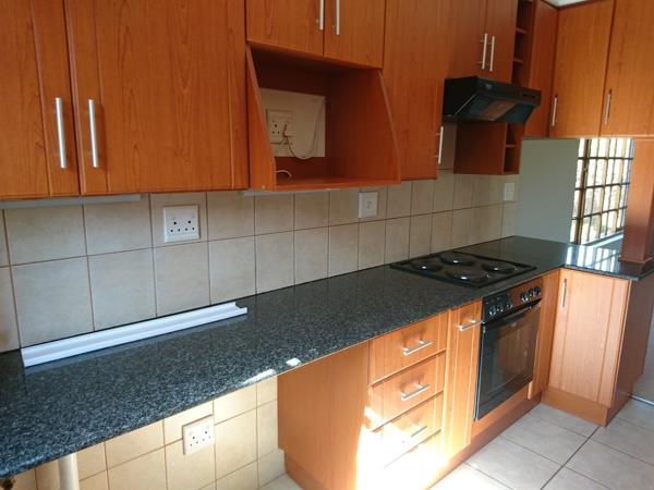 A well maintained Two Bedroom Townhouse with spacious built-in Cupboards, two Bathrooms with showers. Lounge Dinning room. Kitchen with built-in cupboards and stove. Small garden with grass. NO PETS & NO STUDENTS. W&E NRE. 12 month lease. TO LET BOARD Escalation month is September 2023.