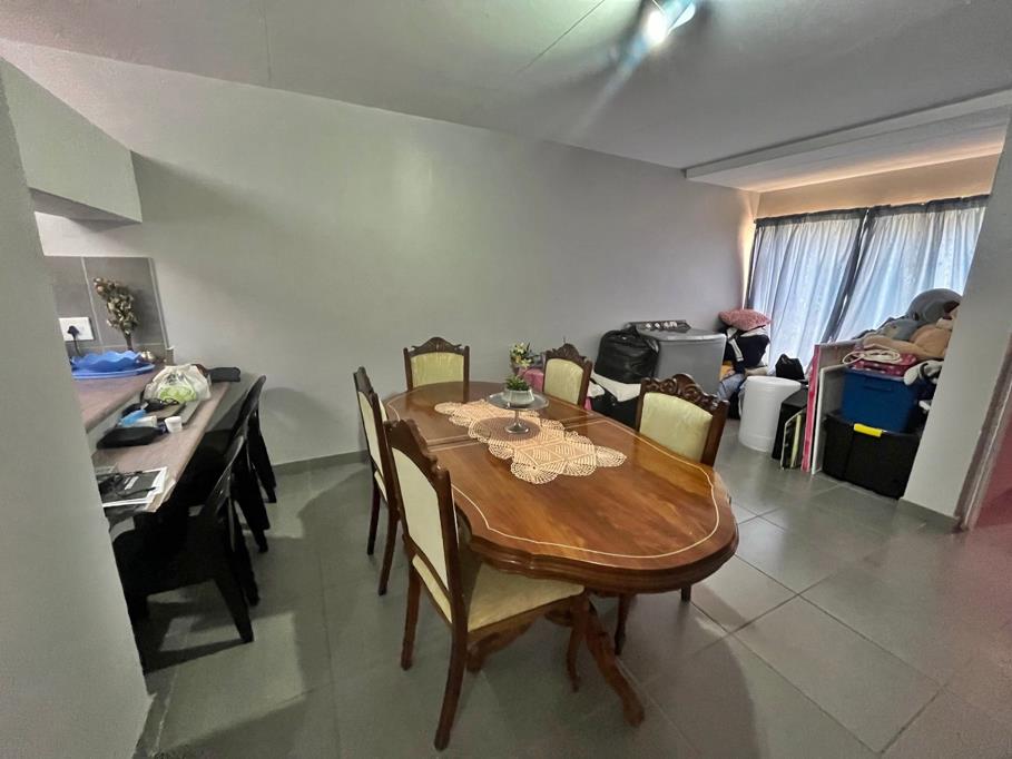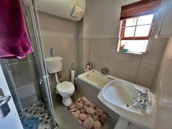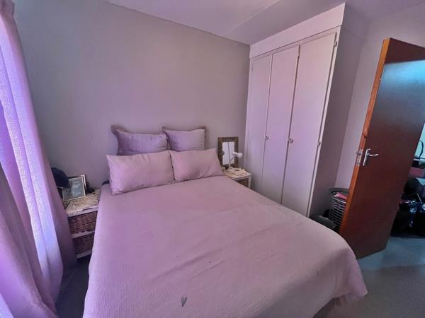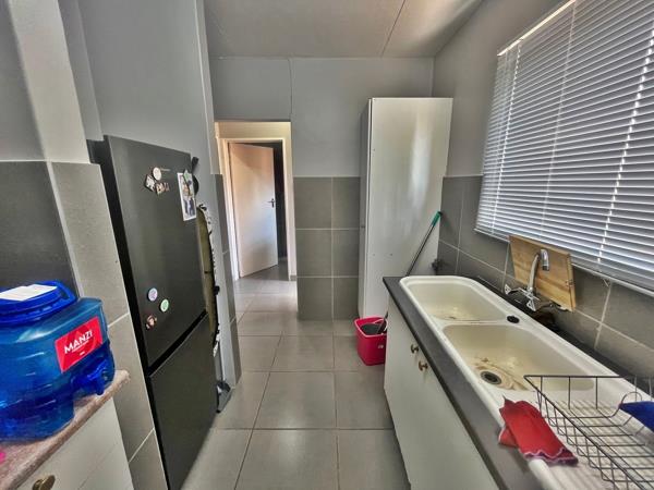 The unit offers two well-sized bedrooms with built-in cupboards and one full bathroom fitted with a bath, shower, basin, and toilet. The open-plan living and dining area creates a comfortable space for everyday living and flows into the functional kitchen, which offers ample cupboard space.