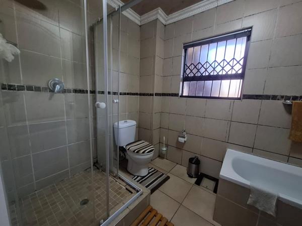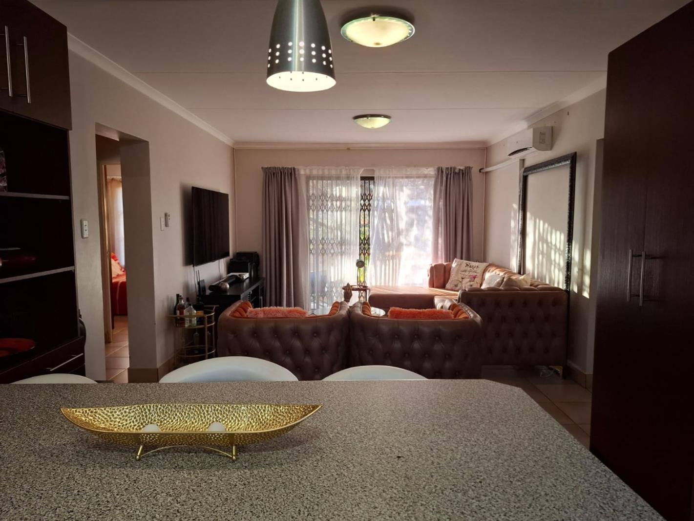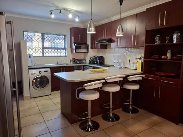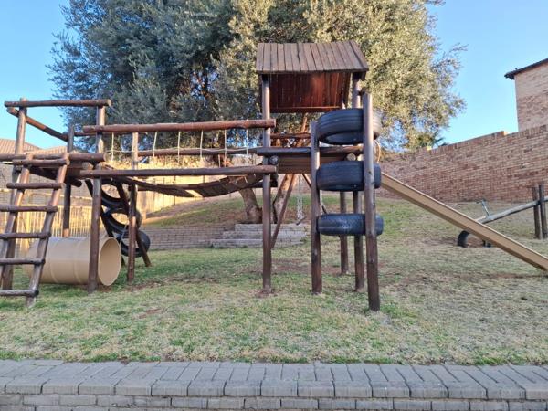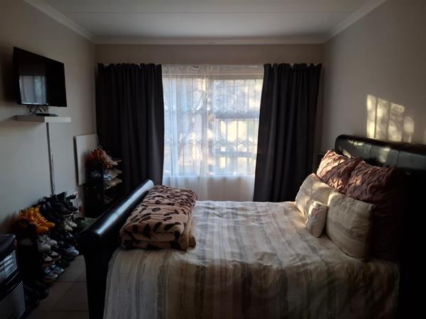 This beautiful townhouse offers you three tiles bedrooms with build in cupboards. Main bedroom with en suite bathroom. Second bathroom also with toilet, bath, shower and basin. Spacious open plan living/dining room leading into the open plan kitchen with build in stove and lots of cupboards. Small back stoep to sit and relax with a beautiful garden. Communal swimming pool with play area for kids. Double carport. Deposit and contract fee payable.
