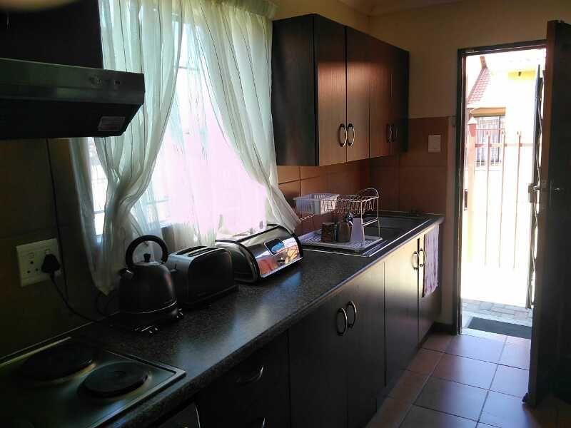 This is a modern three-bedroom house, all the bedrooms have build in cupboards and carpets. There are two bathrooms one of which is a full bathroom with shower, bath, basin, and toilet and the other bathroom has a bath, basin, and toilet. The house has a lounge and a kitchen with a built-in oven and stove. The property has a big fenced-in garden and a carport. Water payable at NRE and electricity pre-paid.