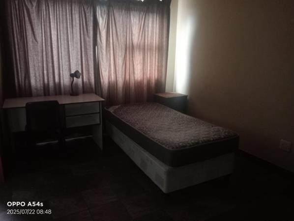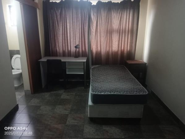 Batchelor flat fully furnished with bathroom and kitchen. Wi-fi and water included. Communal TV room, dining room, pool and braai area. Covered and open parking.