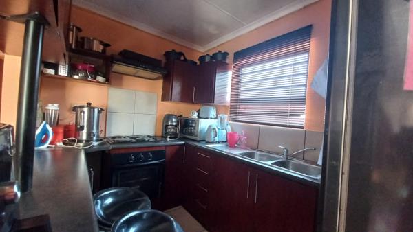 This property boasts an open-plan kitchen with built-in cupboards, providing ample storage and a sleek, contemporary look. The living area is spacious and flows seamlessly into the kitchen, ideal for entertaining or family living.