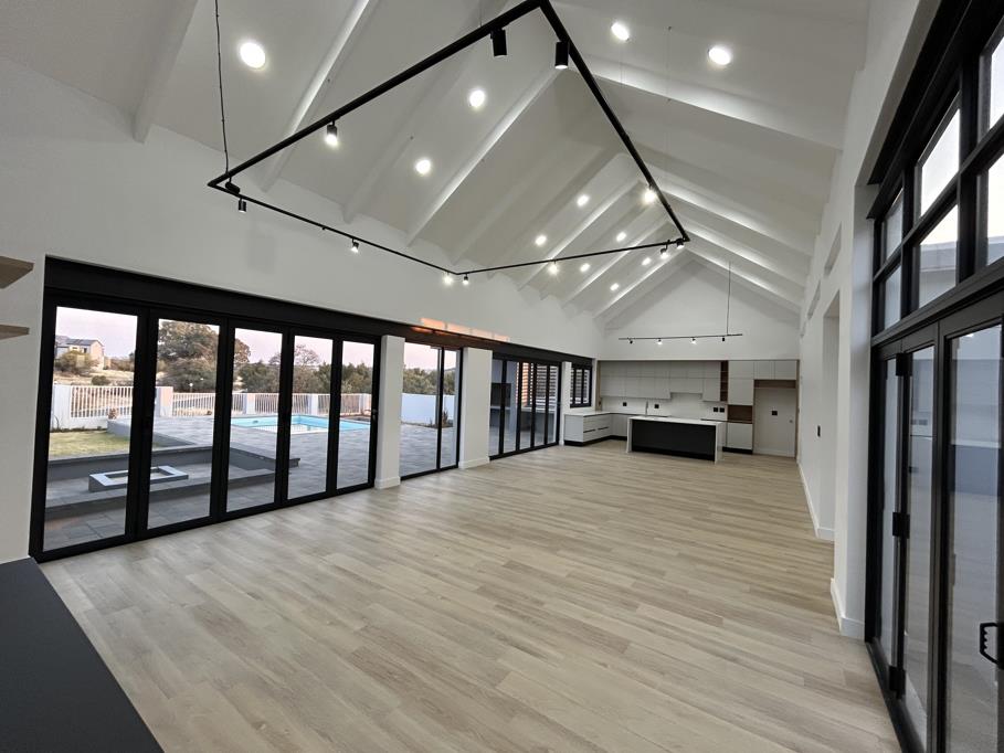 This beautiful home offers four bedrooms with BIC and high-quality vinyl floors throughout the home, three and a half bathrooms with the main and guest rooms being full en-suite. Spacious open plan kitchen and separate scullery and laundry area with connection for your appliances. Stone work tops and an island bench perfectly proportioned for informal dining. Open plan living and dining area with elevated ceilings and bespoke lighting to add to the ambiance this property demands from its surroundings. Built-In braai just off the main living area. Incredible patio and pool terrace with the fire-pit boma for those entertaining evenings with family and friendly.