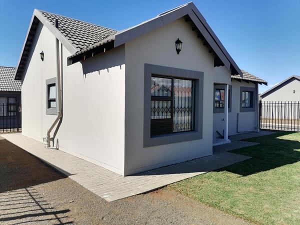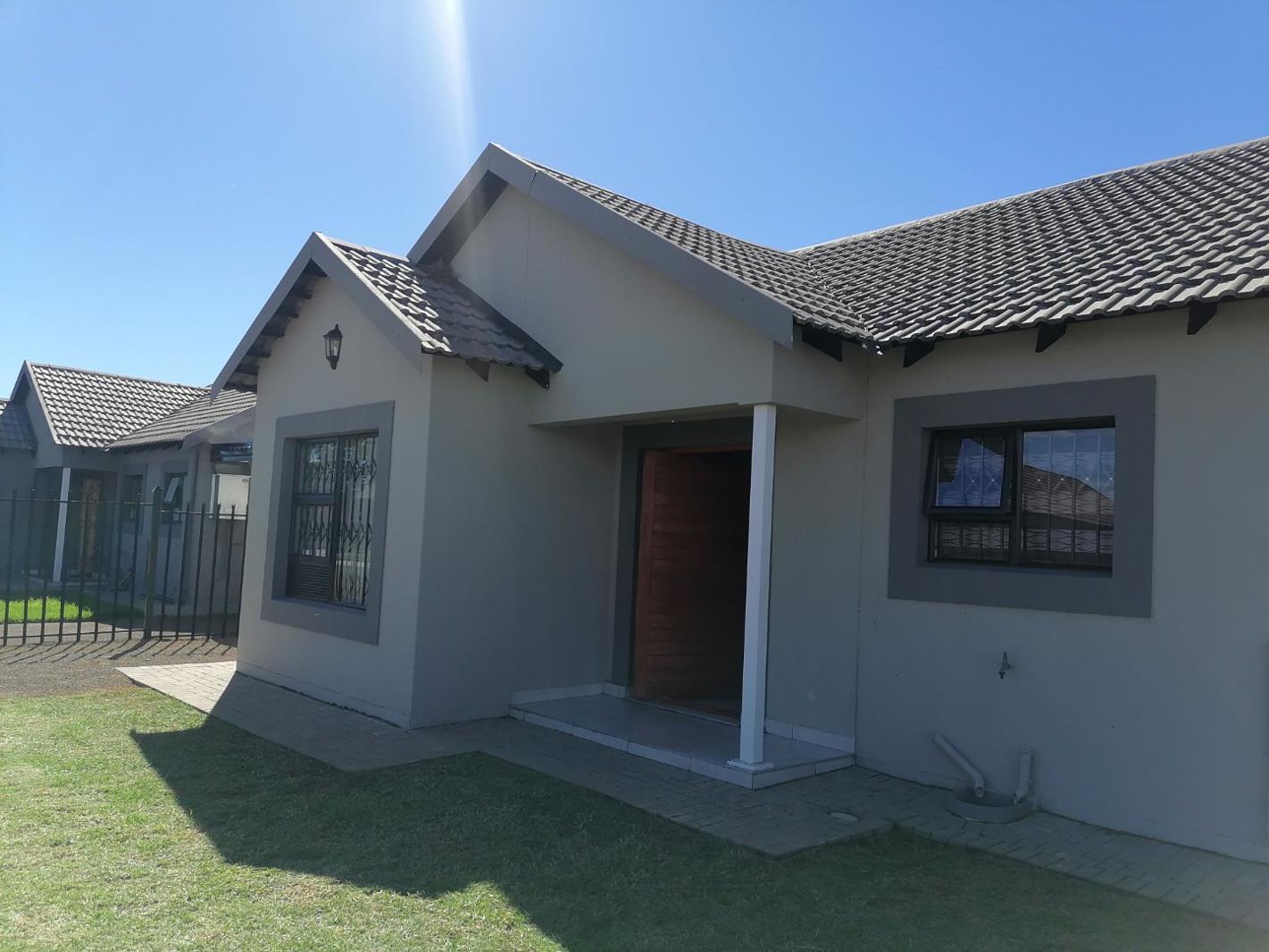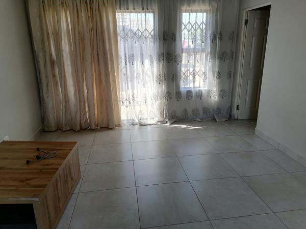 Open plan kitchen with modern finishes and blinds, dining room and lounge. All Tiled flooring. 3 Bedrooms with built in cupboards and curtain rails and 2 bathrooms of which one is main en suite. Secure Parking. Yard is fully fenced. Gas geyser, prepaid electricity and water meter.