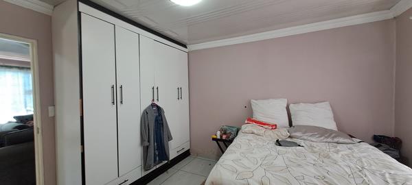 The living room is open plan with the kitchen. The bedroom has built-in cupboards