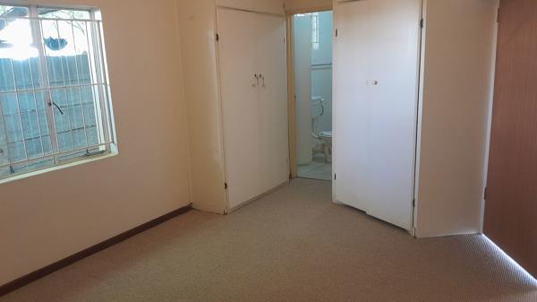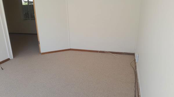 A well size Dining area that is fully carpeted with a One bedroom with build in cupboards.
