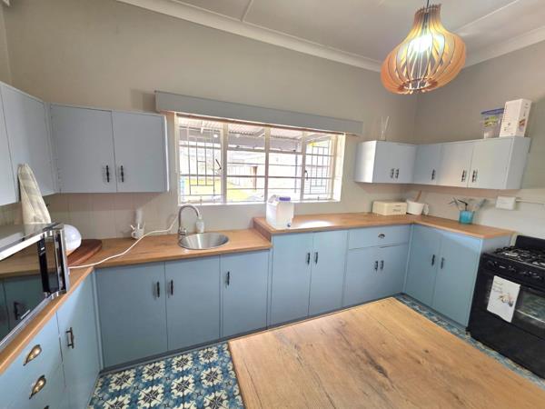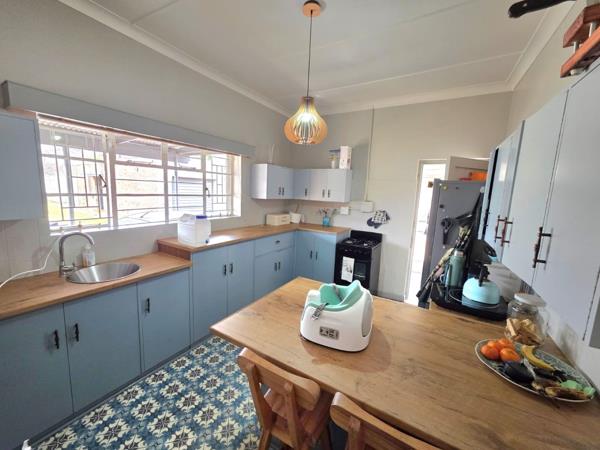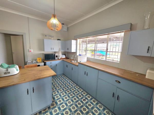 Kitchen with built in cupboards, tile flooring with separate scullery,