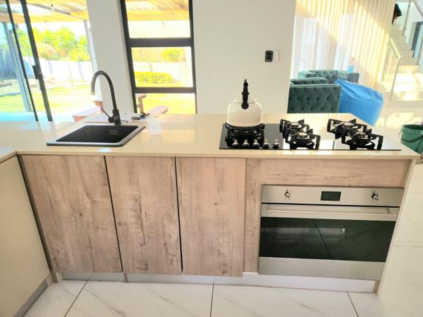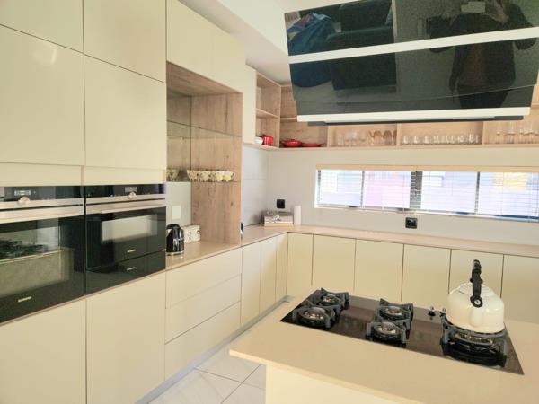 Culinary enthusiasts will love the gourmet open-plan kitchen, boasting striking countertops, a gas hob, under-counter oven, eye-level ovens, and a practical prep bowl. The adjoining scullery is equipped with a double sink and all the necessary appliance connections, making daily life a breeze.