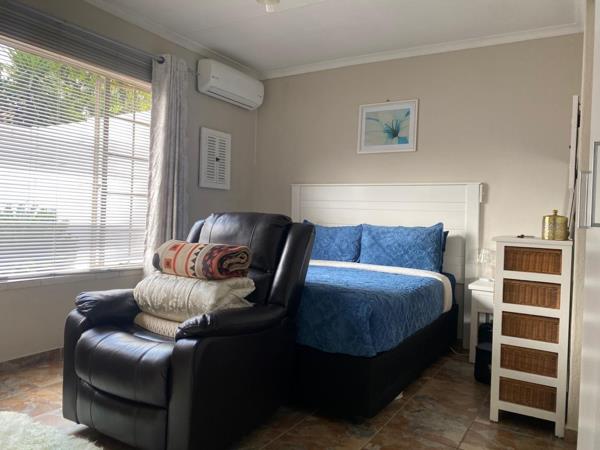 The home features two spacious bedrooms with built-in cupboards and a neat full bathroom. The open-plan kitchen and lounge create a welcoming living space, complemented by air conditioning for year-round comfort.