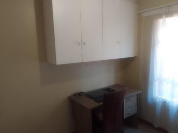 The bedroom is furnished with a bed, desk and chair. The house also has: - Washing machine, Braai area, cutlery, crockery, pots, etc.