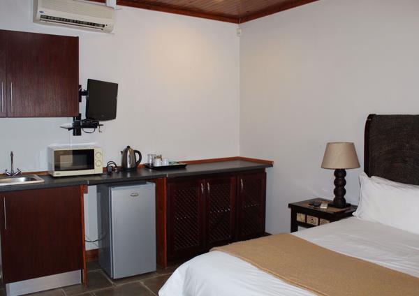 A practical workstation area including a kettle, microwave, two-plate stove, and bar fridge