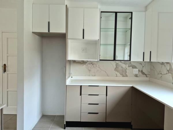 The open plan kitchen has space for a single door fridge and 2 undercounter appliances flowing into a spacious lounge area. The lounge opens onto a private patio and beautifully maintained private garden perfect for entertaining with a lekker braai or simply unwinding after a long day