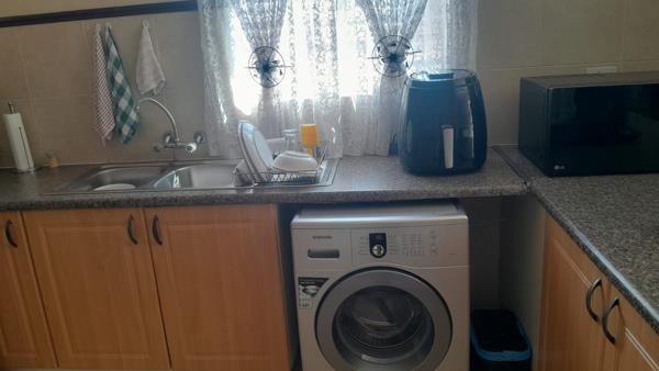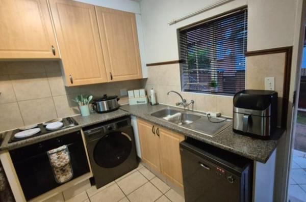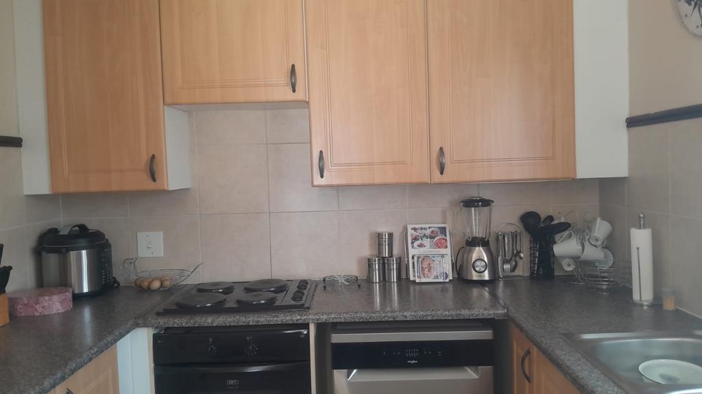 Discover this spacious 114 sqm apartment located in a secure complex in Die Hoewes, Centurion. This well-appointed unit features two bedrooms and two bathrooms, offering comfortable living. The functional kitchen is equipped with light wood cabinetry, granite-look countertops, and a tiled backsplash. It includes fitment for integrated appliances such as a built-in electric hob, oven, dishwasher, and an under-counter washing machine, complimented by a convenient double sink and a breakfast bar. The open-plan layout seamlessly connects the kitchen to the lounge area, creating an inviting space for relaxation and entertainment.