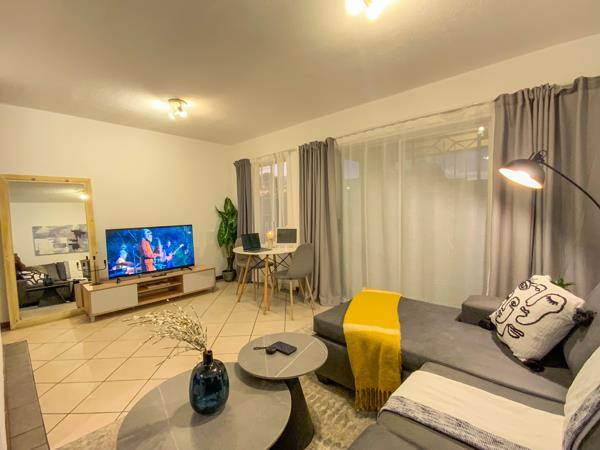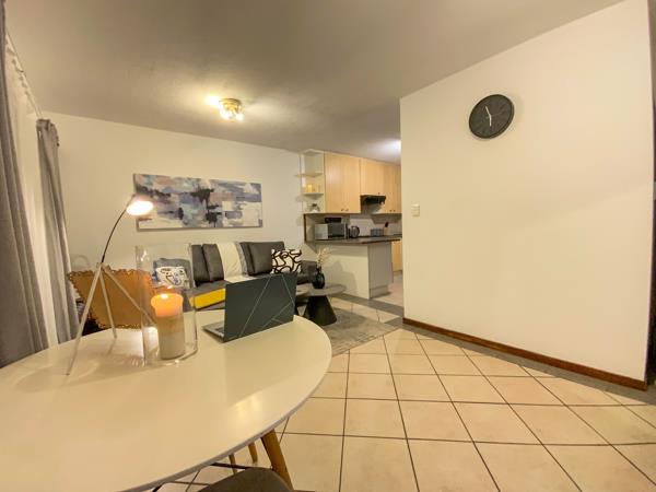 A lovely, modern flat situated on the first floor of a secure complex in Eco Park Estate. Perfectly suited for working professionals and young families. The unit is conveniently tiled throughout and offers 2 spacious bedrooms fully fitted with built in cupboards (BIC) coupled with 1 full bathroom (shower & bath). An open plan kitchen fitted with BIC, with stove and extractor fan and 2 water outlets for your washing machine and dishwasher. The living room is pre-installed with TV cables and satellite dish and fibre ready. There is also a private balcony for your enjoyment.
