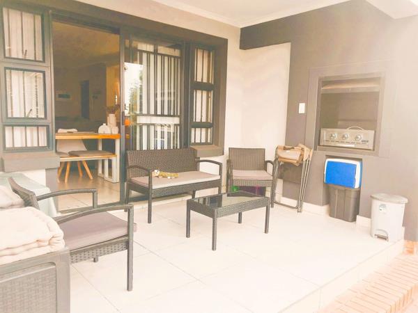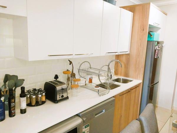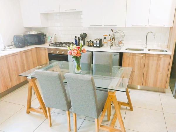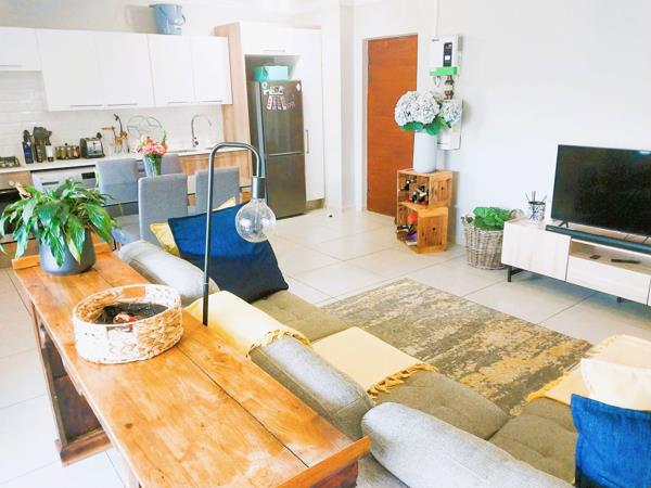Ground floor garden apartment with inverter in Golden Fields Estate. Perfectly situated 2 bedroom apartment with easy access to highway. Two bedrooms with Jack and Jill bathroom bath and shower. The dining, kitchen and sitting room are open plan and walk out to patio and garden. Small pets allowed with permission. Gas hob and gas geyser. Large inverter, dishwasher and washing machine included in rent. Two covered parking bays, large communal swimming pool and plenty walkways in a safe environment. Contact us now to view.