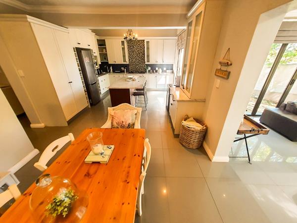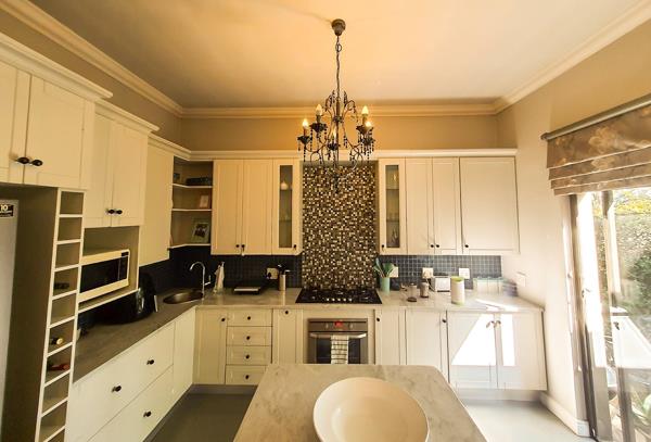 - Kitchen equipped with breakfast centre island counter, gas stove, stone tops - opening up onto garden with sliding door.