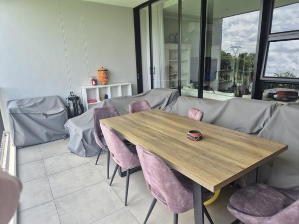 The apartment features a modern open-plan kitchen and living area with floor-to-ceiling windows showcasing peaceful views over the green park areas. An air conditioner ensures year-round comfort in the living space. The master bedroom, also fitted with an air conditioner, enjoys beautiful views and abundant natural light, creating a calm and inviting retreat. A double garage provides secure parking and extra storage.