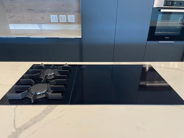 Designer kitchen with centre island, induction stove, electric oven, and 3 appliances