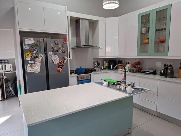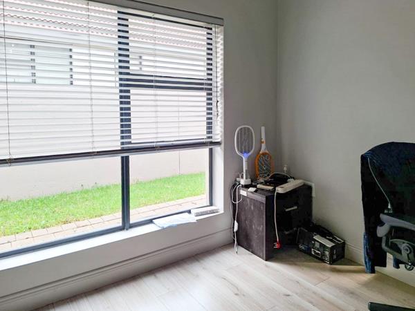 The property features three well-sized bedrooms and two and a half bathrooms. It boasts three versatile living areas, including a dining room, a TV lounge, and an enclosed patio with a built-in braai, perfect for both relaxing and entertaining. A dedicated study nook with built-in cupboards provides an ideal space for working from home.