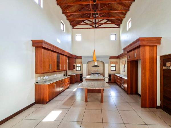 The living areas are enhanced by high ceilings and a charming wood-burning fireplace, adding both character and warmth during cooler months. An enclosed, all-season patio extends the living space even further, featuring a built-in wood braai and overlooking the sparkling swimming pool and auto-irrigated garden.