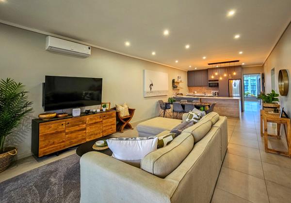 - Large glass sliding doors open onto the expansive balcony with a built-in braai.