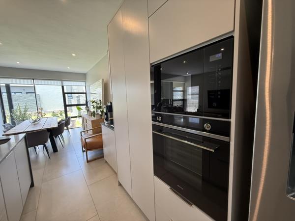 Open plan kitchen with an extended counter providing ample worktop space with induction stove top. The modern kitchen has a built in SMEG oven, microwave and space for a double refrigerator. The stylish kitchen has ample cupboard space in both the kitchen and scullery which also has space for 3 appliances.