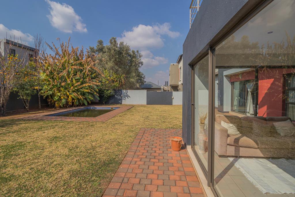 The patio opens to a beautifully landscaped garden and sparkling swimming pool, creating a peaceful outdoor retreat.
